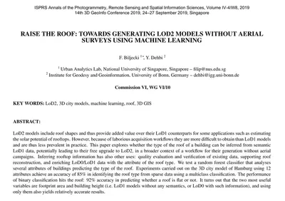 Biljecki F, Dehbi Y (2019): Raise the roof: towards generating LoD2 models without aerial surveys using machine learning. ISPRS Ann. Photogramm. Remote Sens. Spatial Inf. Sci. IV-4/W8:27-34. 10.5194/isprs-annals-IV-4-W8-27-2019 PDF