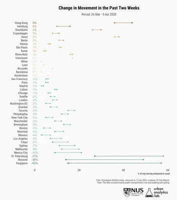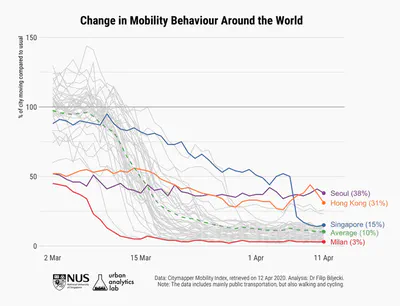 Singapore experienced the sharpest drop among all 41 cities. This may be good news as it indicates that people are taking the measures seriously, drastically changing their behaviour overnight.