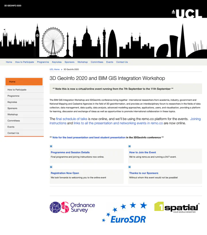 3D GeoInfo is a key conference in the 3D GIS community. Last year we have been involved in its organisation in Singapore. This year, the 15th instance, was organised by the University College London, together with the 3rd BIM/GIS Integration Workshop.