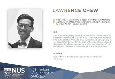 Year 4 NUS Geography undergraduate with a double minor in Geospatial Information Systems (GIS) & Urban Studies, with skill sets in Geospatial Analytics, Data Analysis and Cartography. I am especially interested in the area of Geospatial Analysis and Geospatial Database Management with the intention of value-adding in the area of Urban Planning and Development.