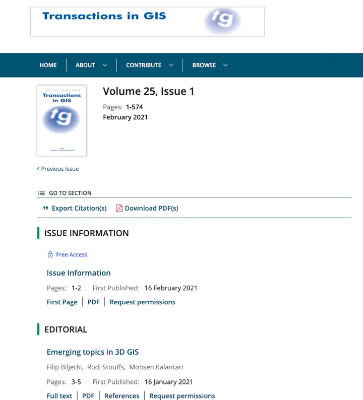 The special issue has been edited by Filip Biljecki, Rudi Stouffs, and Mohsen Kalantari, and it has been published in the February 2021 issue (vol. 25, issue 1) of the journal.