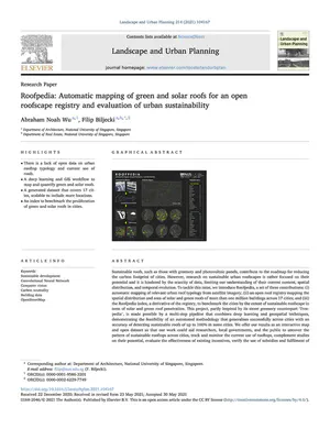 Wu AN, Biljecki F (2021): Roofpedia: Automatic mapping of green and solar roofs for an open roofscape registry and evaluation of urban sustainability. Landscape and Urban Planning 214: 104167. 10.1016/j.landurbplan.2021.104167 PDF
