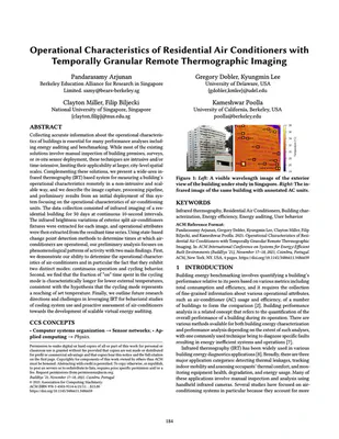 Arjunan P, Dobler G, Lee K, Miller C, Biljecki F, Poolla K (2021): Operational characteristics of residential air conditioners with temporally granular remote thermographic imaging. BuildSys ‘21: Proceedings of the 8th ACM International Conference on Systems for Energy-Efficient Buildings, Cities, and Transportation, pp. 184–187. 10.1145/3486611.3486659 PDF