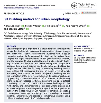 Labetski A, Vitalis S, Biljecki F, Arroyo Ohori K, Stoter J (2023): 3D building metrics for urban morphology. International Journal of Geographical Information Science, 37(1): 36-67. 10.1080/13658816.2022.2103818 PDF