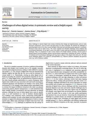 Lei B, Janssen P, Stoter J, Biljecki F (2023): Challenges of Urban Digital Twins: A Systematic Review and a Delphi Expert Survey. Automation in Construction 147: 104716. 10.1016/j.autcon.2022.104716 PDF