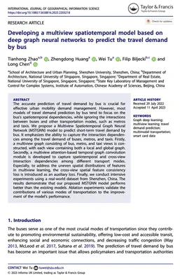 Zhao T, Huang Z, Tu W, Biljecki F, Chen L (2023): Developing a multiview spatiotemporal model based on deep graph neural networks to predict the travel demand by bus. International Journal of Geographical Information Science, 37(7): 1555-1581. 10.1080/13658816.2023.2203218 PDF