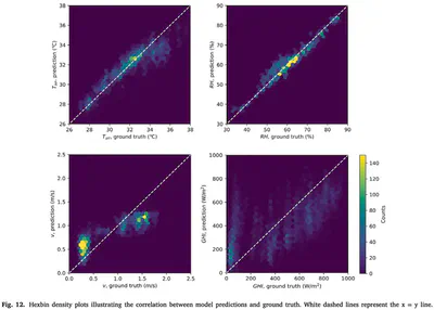 - High accuracy: RMSE at 0.95 °C (T_air), 2.57% (RH), 0.31 m/s (v), 225 W/m2 (GHI).