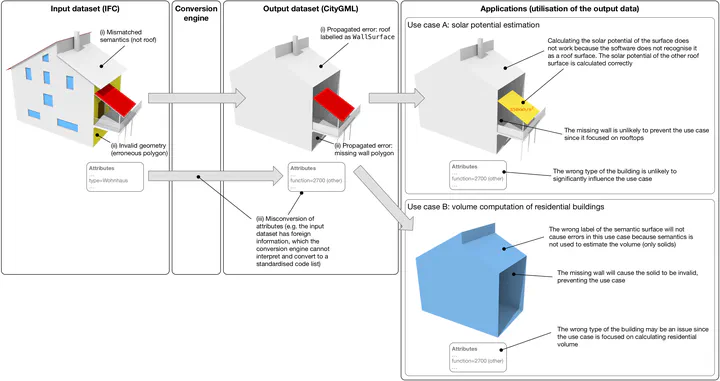 Much work has been done on quality of geoinformation and interoperability between BIM and GIS. However, the intersection of the two – quality control of the conversion between BIM and GIS – remains uncharted. This discussion paper, based on empirical results, is one of the first steps towards mapping out a framework on errors and quality control in the context of BIM–GIS interoperability. In our work we focus on the conversion from IFC to CityGML, identifying several systematic errors potentially common and/or exclusive to the context of BIM–GIS conversion. Besides exposing several faults pertaining to IFC-sourced 3D city models, we discuss their taxonomy and their potential impact when engaged in applications. This paper is also relevant with respect to the growing popularity of conversion between IFC and CityGML, potentially aiding others to avoid many of the errors that can occur in the process and establishing directions to set up a benchmark to assess the performance of the interoperability workflows.