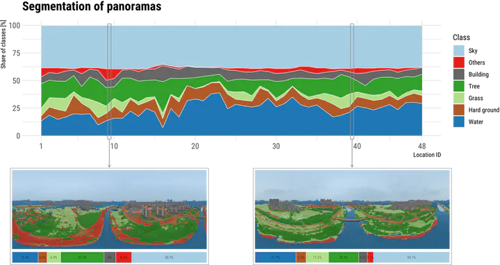 Traditional approaches for visual perception and evaluation of river landscapes adopt on-site surveys or assessments through photographs. The former is expensive, hindering large-scale analyses, and it is conducted only on street-level or top-down imagery. The latter only reflects the subjective perception and also entails a laborious process. Addressing these challenges, this study proposes an alternative: a novel workflow for visual analysis of urban river landscapes by combining unmanned aerial vehicle (UAV) oblique photography with computer vision (CV) and virtual reality (VR). The approach is demonstrated with an experiment on a section of the Grand Canal in China where UAV oblique panoramic imagery has been processed using semantic segmentation for visual evaluation with an index system we designed. Concurrent surveys, immersive and non-immersive VR, are used to evaluate these photos, with a total of 111 participants expressing their perceptions across multiple dimensions. Then, the relationship between the people’s subjective visual perception and the river landscape environment as seen by computers has been established. The results suggest that using this approach, rivers and surrounding landscapes can be analyzed automatically and efficiently, and the mean pixel accuracy (MPA) of the developed model is 90%, which advances state of the art. The results of this study can benefit urban planners in formulating riverside development policies, analyzing the perception of plans for a future scenario before an area is redeveloped, and the method can also aid relevant parties in having a macro understanding of the overall situation of the river as a basis for follow-up research. Due to simplicity, accuracy and effectiveness, this workflow is transferable and cost-effective for large-scale investigations of riverscapes and linear heritage. We openly release Semantic Riverscapes—the dataset we collected and processed, bridging another gap in the field.
