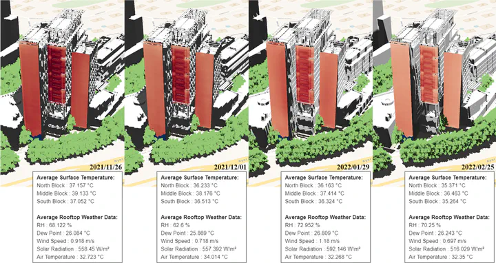 Recently, the concept of a digital twin for the built environment has received significant attention due to its potential benefits to urban planners, engineers, and designers. The development of tools that aid in integrating real-world physical systems with digital capabilities is essential for advancing digital twin technology. In this work, we present one such digital twin tool that integrates the longitudinal thermal envelope data of buildings on the campus of the National University of Singapore with a virtual 3D model. Thermal images of the buildings were captured using a neighborhood-scale infrared observatory for a few months. The temperature profile of one of the buildings was extracted and mapped on the virtual 3D model. The digital twin model is developed in the deck.gl platform. This is one of the few studies on developing a dynamic digital twin incorporating temporally and spatially varying urban-scale 2D temperature envelope data with the virtual 3D model. The digital twin platform can study the microclimate and help urban planners identify the building elements contributing to the urban heat island (UHI) effect at the neighborhood scale.