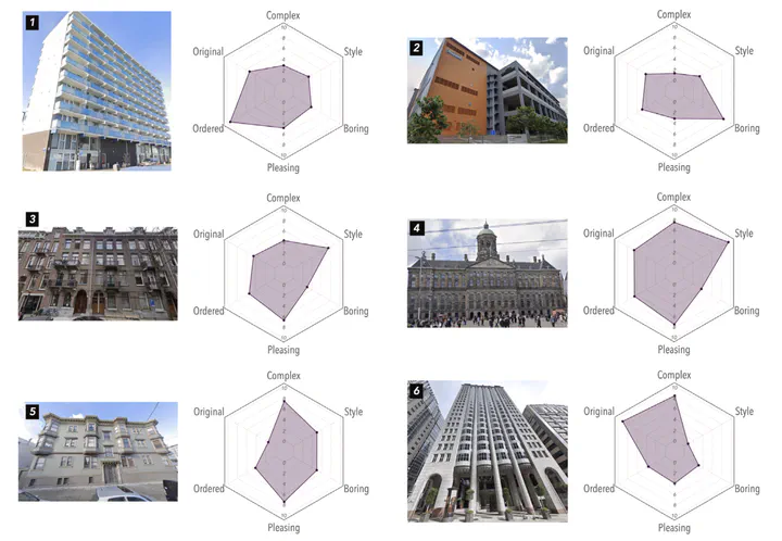 Building appearances profoundly shape the urban visual landscape, influencing city images and the quality of urban life. Traditional methods for evaluating the perceptual and aesthetic qualities of building facades are often limited in scope. Despite recent studies that have sought to understand human perception of urban streetscapes, our grasp of how individuals perceive building exteriors on a broader scale and the subsequent impact on holistic street experiences, remains largely unexplored. In this study, we integrate a traditional survey-based evaluation framework with machine learning techniques to analyse human perception of over 250,000 building images from Singapore, San Francisco, and Amsterdam. Specifically, deep learning models trained on crowdsourced ratings of 1,200 building images across six perceptual attributes — complex, original, ordered, pleasing, boring, and style — achieve over 72% accuracy. This novel approach enables adaptive and comparative analyses of building appearances across regions, revealing spatial patterns in the perception of architectural exteriors and their relationships with functions, age, and location. Moreover, by applying propensity score matching to match images based on their features, we mark one of the first efforts to investigate the perceptual impacts of buildings on streetscape perceptions. The results show that streetscapes with higher levels of complex, pleasing, and historical ambience from buildings elicit more positive perceptions, whereas modern and monotonous exteriors often evoke holistic feelings of being “boring” and “depressing”. These findings offer architects and city planners valuable insights into public sentiment towards city-level building exteriors and their influence on urban identity and perception.