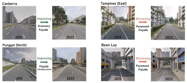 The well-being of residents is considerably influenced by the quality of their environment. However, due to the lack of large-scale quantitative and longitudinal evaluation methods, it has been challenging to assess residents’ satisfaction and achieve social inclusion goals in neighborhoods. We develop a novel cost-effective method that utilizes time series street view imagery for evaluating and monitoring visual environmental quality in neighborhoods. Unlike most research that relies on site visits or surveys, this study trains a deep learning model with a large-scale dataset to analyze six perception indicators’ scores in neighborhoods in different geographies and does so longitudinally thanks to imagery taken over a period of a decade, a novelty in the body of knowledge. Implementing the approach, we examine public housing neighborhoods in Singapore and New York City as case studies. The results demonstrated that temporal imagery can effectively assess spatial equity and monitor the visual environmental qualities of neighborhoods over time, providing a new, comprehensive, and scalable workflow. It can help governments improve policies and make informed decisions on enhancing the design and living standards of urban residential areas, including public housing communities, which may be affected by social stigmatization, and monitor the effectiveness of their policies and actions.