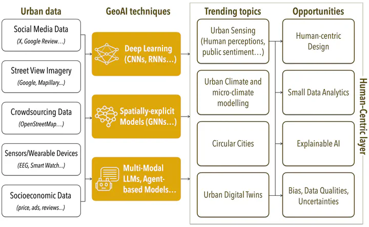 Recognising GeoAI as an emerging and rapidly evolving field that has been increasingly adopted in urban geography, this chapter provides an overarching overview of the GeoAI methods for urban analytics. It begins by revisiting the theoretical underpinnings of urban theory and mapping the evolution of urban spatial analytics, tracing the journey from traditional statistical methods to the cutting-edge AI-driven approaches reshaping the discipline today. Beyond examining the current state of GeoAI, the chapter also identifies current trending topics and investigates future directions for developing human-centric methodologies that prioritise the needs and experiences of urban residents. By emphasising the human dimension of urban analytics, the chapter seeks to contribute to the ongoing discourse on how GeoAI can be harnessed to enhance city governance, urban planning, and the overall quality of urban life.