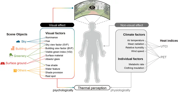 Outdoor thermal comfort is a crucial determinant of urban space quality. While research has developed various heat indices, such as the Universal Thermal Climate Index (UTCI) and the Physiological Equivalent Temperature (PET), these metrics fail to fully capture perceived thermal comfort. Beyond environmental and physiological factors, recent research suggests that visual elements significantly drive outdoor thermal perception. This study integrates computer vision, explainable machine learning, and perceptual assessments to investigate how visual elements in streetscapes affect thermal perception. To provide a comprehensive representation of diverse visual elements, we employed multiple computer vision models (viz. Segment Anything Model, ResNet-50, and Vision Transformer) and applied the Maximum Clique method to systematically select 50 representative ground-level images, each paired with a corresponding thermal image captured simultaneously. An outdoor, web-based survey among 317 students collected thermal sensation votes (TSV), thermal comfort votes (TCV), and element preference data, yielding 2,854 valid responses. The same survey was replicated in an indoor exhibition setting to provide a comparative reference against the outdoor experiment. A Random Forest classifier achieved 70% and 68% accuracy in predicting thermal sensation and comfort, respectively. Using Shapley Additive Explanations to interpret model outcomes, we uncovered that the colour magenta emerged as the most influential visual factor for thermal perception, while greenery – despite being participants most preferred element for cooling – showed weaker correlation with actual thermal perception. These findings challenge conventional assumptions about visual thermal comfort and offer a novel framework for image-based thermal perception research, with important implications for climate-responsive urban design.