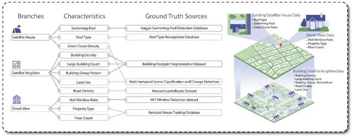 Buildings play a crucial role in shaping urban environments, influencing their physical, functional, and aesthetic characteristics. However, urban analytics is frequently limited by datasets lacking essential semantic details as well as fragmentation across diverse and incompatible data sources. To address these challenges, we conducted a comprehensive meta-analysis of 6,285 publications (2019–2024). From this review, we identified 11 key visually discernible building characteristics grouped into three branches: satellite house, satellite neighborhood, and street-view. Based on this structured characteristic system, we introduce BuildingMultiView, an innovative framework leveraging fine-tuned Large Language Models (LLMs) to systematically extract semantically detailed building characteristics from integrated satellite and street-view imagery. Using structured image–prompt–label triplets, the model efficiently annotates characteristics at multiple spatial scales. These characteristics include swimming pools, roof types, building density, wall–window ratio, and property types. Together, they provide a comprehensive and multi-perspective building database. Experiments conducted across five cities in the USA with diverse architecture and urban form, San Francisco, San Diego, Salt Lake City, Austin, and New York City, demonstrate significant performance improvements, with an F1 score of 79.77% compared to the untuned base version of ChatGPT’s 45.66%. These results reveal diverse urban building patterns and correlations between architectural and environmental characteristics, showcasing the framework’s capability to analyze both macro-scale and micro-scale urban building data. By integrating multi-perspective data sources with cutting-edge LLMs, BuildingMultiView enhances building data extraction, offering a scalable tool for urban planners to address sustainability, infrastructure, and human-centered design, enabling smarter, resilient cities.
