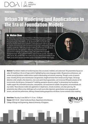Foundation models are transforming how cities are sensed, modeled, and understood. This presentation focuses on urban 3D modeling in the era of large-scale AI, highlighting how vision-language models, 3D generative architectures, and remote sensing foundation models enhance spatial understanding and semantic reasoning. Through a series of research cases—including 3D city scene reconstruction and generation, height estimation from remote sensing images, 3D change detection under complex urban dynamics, cross-scene point cloud segmentation, and immersive VR-based evaluation of 3D environments—the talk gives a framework of “modeling–perception–dynamic analysis” to demonstrate how foundation models support the automated construction, interpretation, and assessment of scalable, fine-grained, and semantically rich city models. These advances enable new applications in digital twins, climate simulation, and urban planning. The presentation also reflects on key challenges such as multi-source data alignment, generalization across geography and sensors, and real-time performance, offering a forward-looking perspective on AI-driven, human-centered urban modeling.