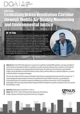 More than 99% of the population’s exposure to air pollution exceeds WHO guidelines, and approximately 4.2 million deaths are attributed to ambient air pollution annually. Fortunately, effective urban ventilation can facilitate the dispersion of air pollutants and mitigate potential health hazards. This need arises from the desire to gain detailed insights into the distribution of Urban Ventilation Corridors (UVCs) and their effects on air pollution dispersion, as well as to facilitate effective management strategies. This talk will introduce the UVC extraction through 2D and 3D urban morphological elements and UVC evaluation by: 1). comparing hyperlocal spatiotemporal variation of air pollutants through mobile monitoring; 2). quantifying the environmental justice of air pollution exposure for different socio-economic communities; and 3). leveraging the explainable machine learning models (GeoAI, Geospatial Artificial Intelligence) to predict air pollution levels and evaluate the UVC effects in detail.